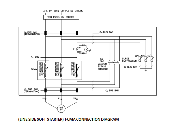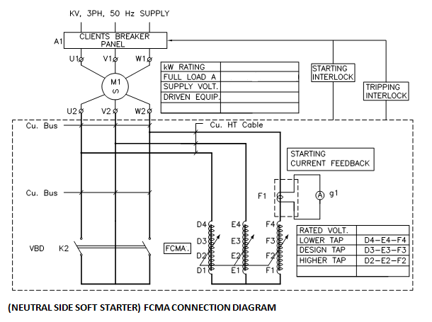 Flux Compensated Magnetic Amplifier soft starters are step less reduced Voltage starters which ensure a constant low starting current with incremental voltage and torque to the motor to achieve smooth acceleration of the drive. The Soft Starter is connected in series with the motor either on the line side or neutral side and thus controls the starting current and starting torque As the motor speed increases the FCMA impedance decreases to achieve incremental voltage and torque for the motor while keeping the current constant. The voltage across the motor increases smoothly from starting to run value with motor speed. A built-in bypass contactor closes to ensure full voltage running of the motor. Bypass contactor operation can be time, Current or speed based.